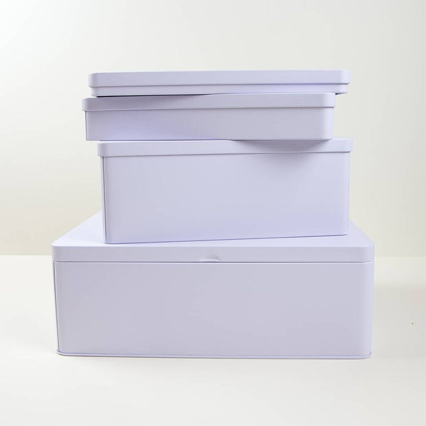 The tin is available in 5 different sizes, including 4 rectangle tins in varying depth and a fun lunchbox style tin with handle and metal clasps (see dimensions for all sizes).